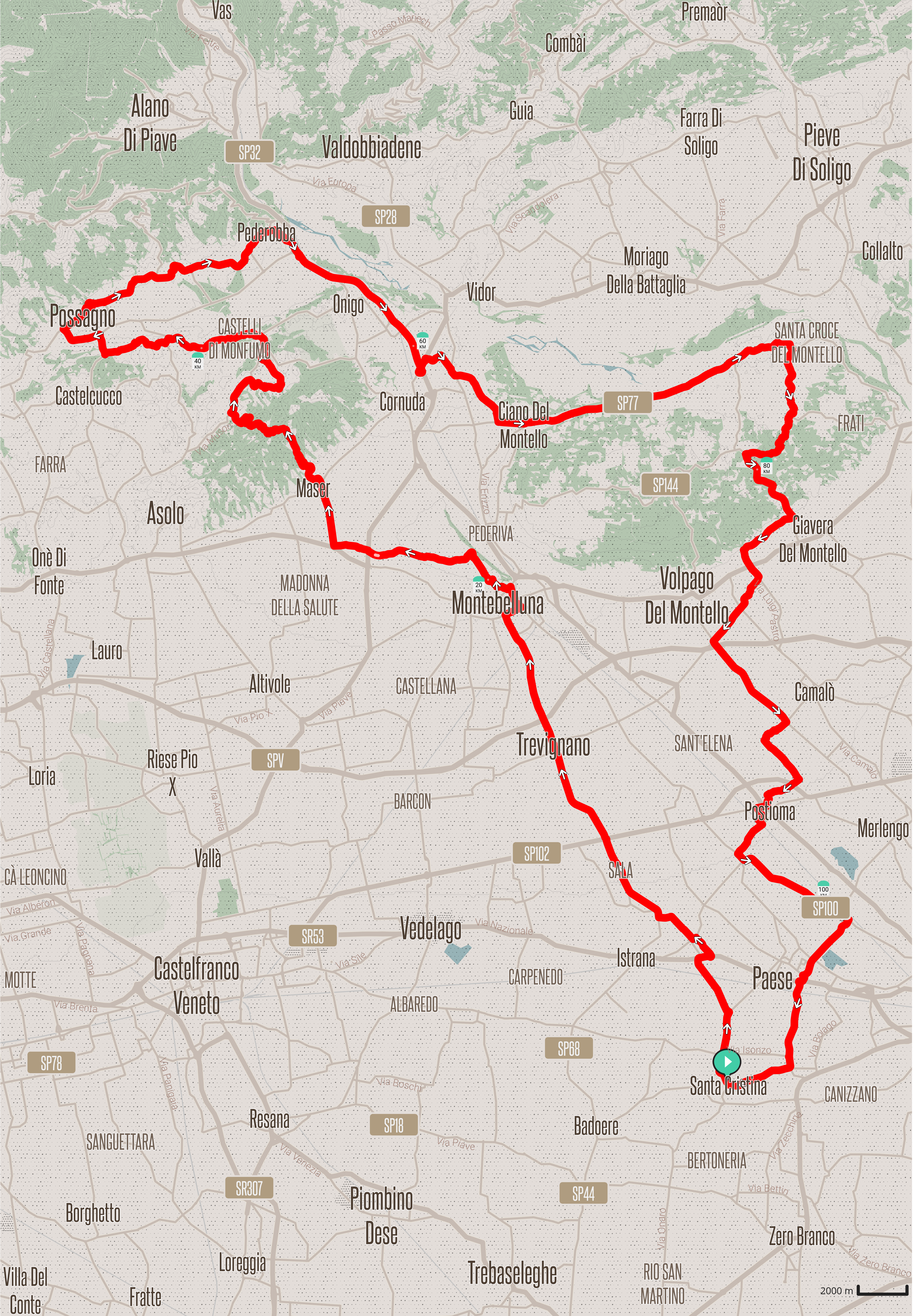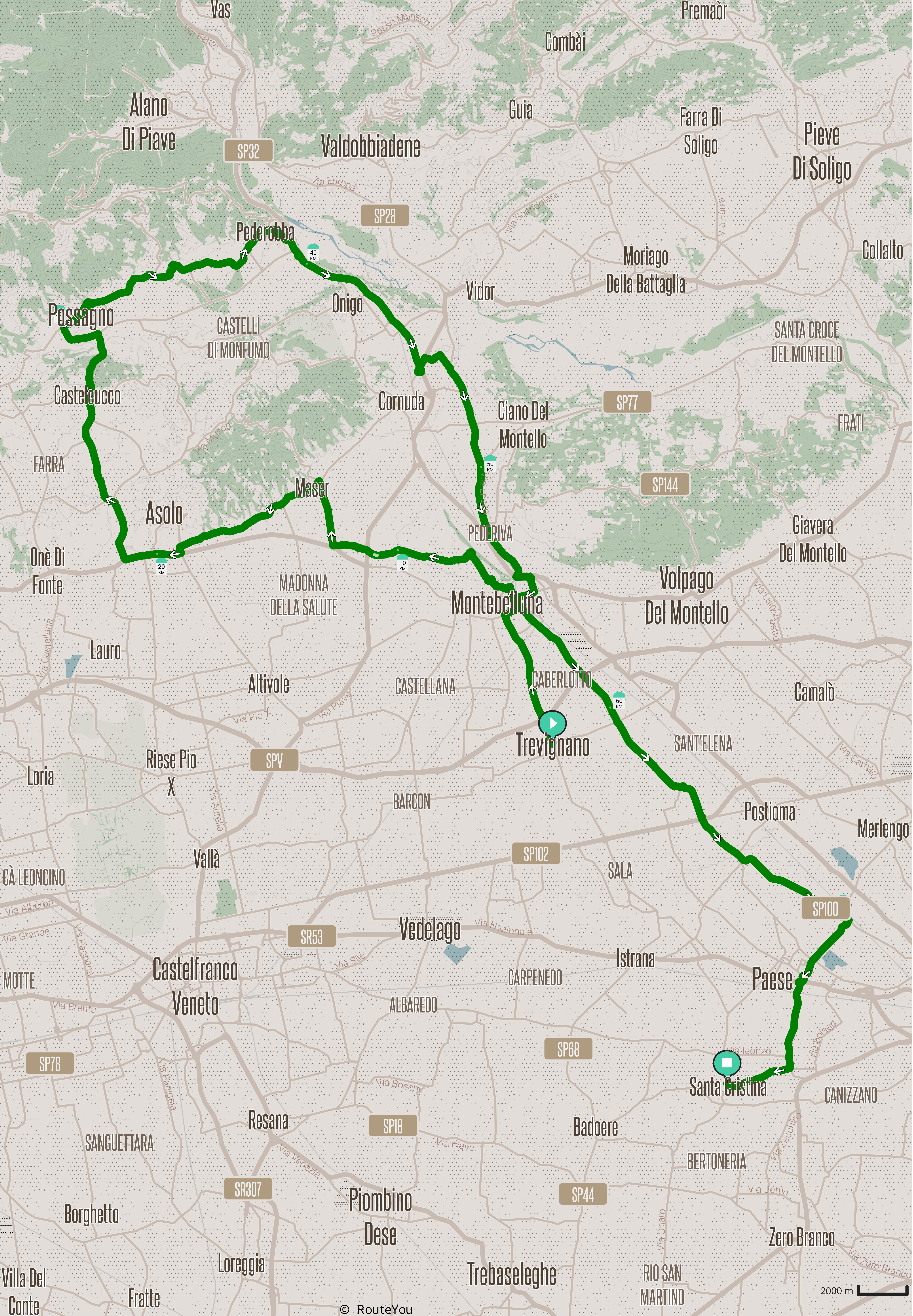 Santa Cristina, Padernello, Trevignano, Montebelluna, Mercato Vecchio, Caerano San Marco, Maser, Forcella Mostacin, La Valle, Cà Baldi, Palazzo Neville, Castelli di Monfumo, Castelcies, Bocca di Serra, Costalunga, A DX SP.6, Possagno (RISTORO), Caniezza, Cavaso del Tomba, Pederobba; SR348 Feltrina, Uscita verso Vidor, Rotatoria a DX Via Guizzona, A DX Via dei Neville, A DX Via Guizza, Crocetta del Montello Via Piave, Panoramica, Salita Via Del Solstizio (Presa V), A DX Dorsale, A SX Via degli Alpini (Presa V), Giavera del Montello, Camalò, Via Postumia, Postumia, Porcellengo, Castagnole, Paese, Quinto di Treviso, Santa Cristina.