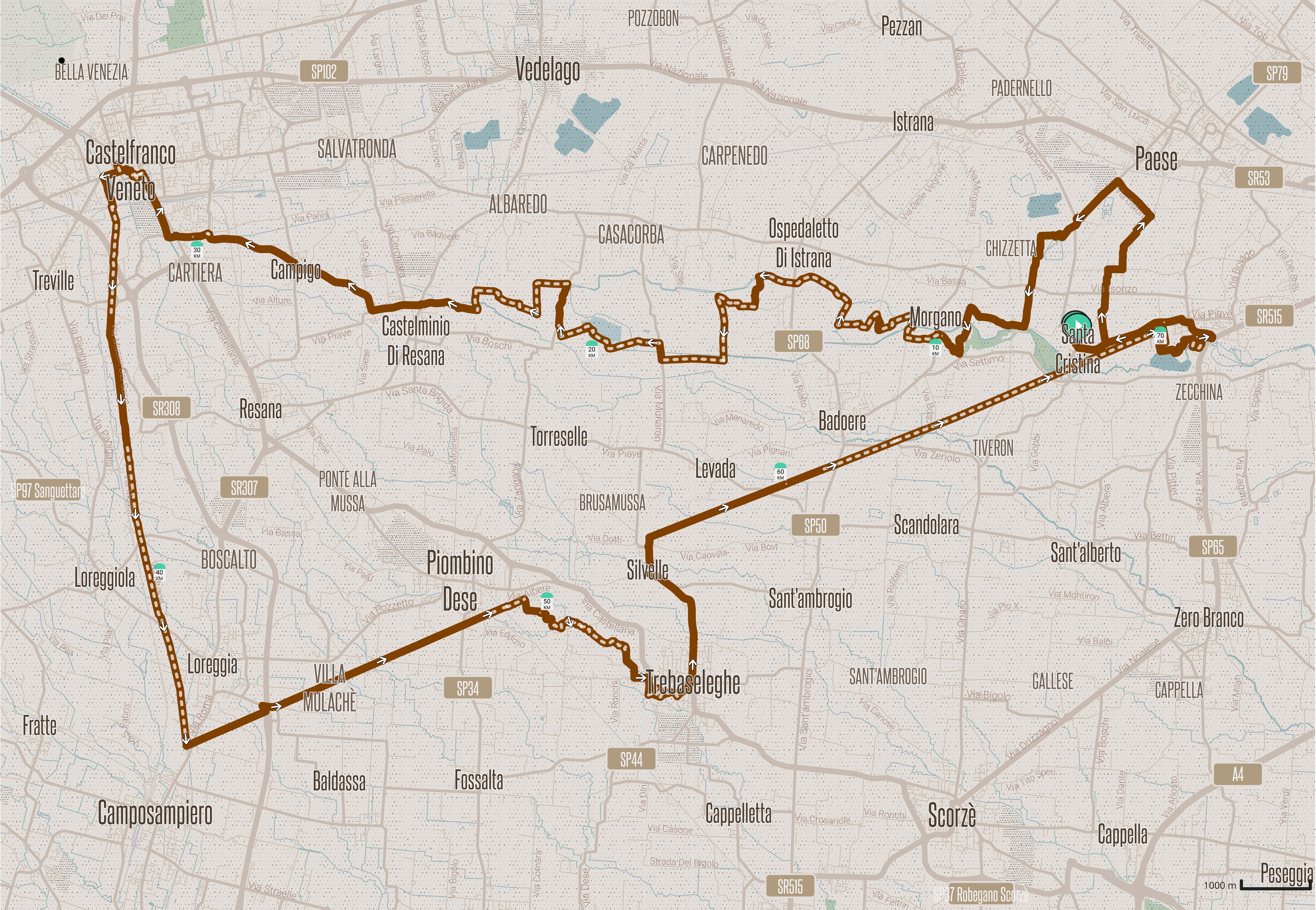 Santa Cristina, Loc. Altana, Morgano, Ospedaletto di Istrana, Gran Bosco dei Fontanassi, San Marco di Resana, Campigo, Castelfranco Veneto, Ciclabile Muson dei Sassi, Ciclabile Ostiglia, Trebaseleghe Via delle Risorgive-Via Spellateria, Parco Draganziolo, Silvelle, Ciclabile Ostiglia, Badoere, Quinto di Treviso, Santa Cristina.